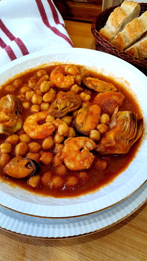 GUISO DE GARBANZOS CON LANGOSTINOS Y ALCACHOFAS: 4 alcachofas, 18 langostinos, 19 mejillones (en este caso ya cocidos), 100 gramos de jamón serrano a taquitos, 400 gramos de garbanzos cocidos, 50 ml de vino blanco, 1 cebolla, 2 ajos, 4 rodajas de pan seco, 1 pimiento verde, 2 cucharadas de tomate concentrado, 1 cucharada de pimentón dulce, 1/2 limón, sal, aceite de oliva, 1 litro de caldo de pescado (Lo preparamos con las cáscaras y cabezas de los langostinos).