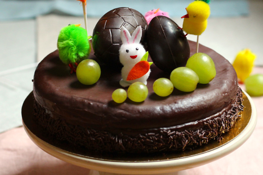 Una vez retirada la mona del horno ya fría, la bañamos con el chocolate sobre una rejilla, la dejamos enfriar y colocamos después sobre una superficie lisa. La terminamos de decorar con los fideos y los huevos de chocolate y la dejamos un par de horas en la nevera para que coja consistencia la cobertura.