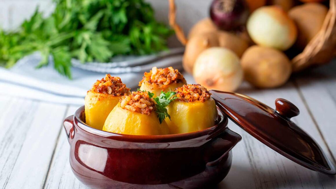 Este plato pertenece al tipo de comida de los dolmas, que son hojas de parra o verduras como tomates, berenjenas o pimientos que se utilizan como recipiente para rellenar con ingredientes, como arroz, carne picada, salsas y especias. En esta ocasión, vamos a utilizar patatas como recipiente para el relleno, siendo una opción cada vez más popular en la gastronomía turca.