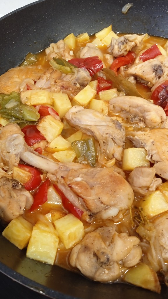 POLLO A LA CERVEZA CON PIMIENTOS – Receta fácil y rápida.SIN HORNO Ingredientes: 1 pollo troceado de un kilo y medio aproximadamente, 1 pimiento verde, 1 pimiento rojo, 3 cebollas, 3 dientes de ajo, 3 cucharadas de tomate frito, 330 ml de cerveza, 250 ml de caldo, 1 ramita de tomillo, 2 hojas de laurel, Aceite de oliva, sal y pimienta, Patatas fritas (opcional).