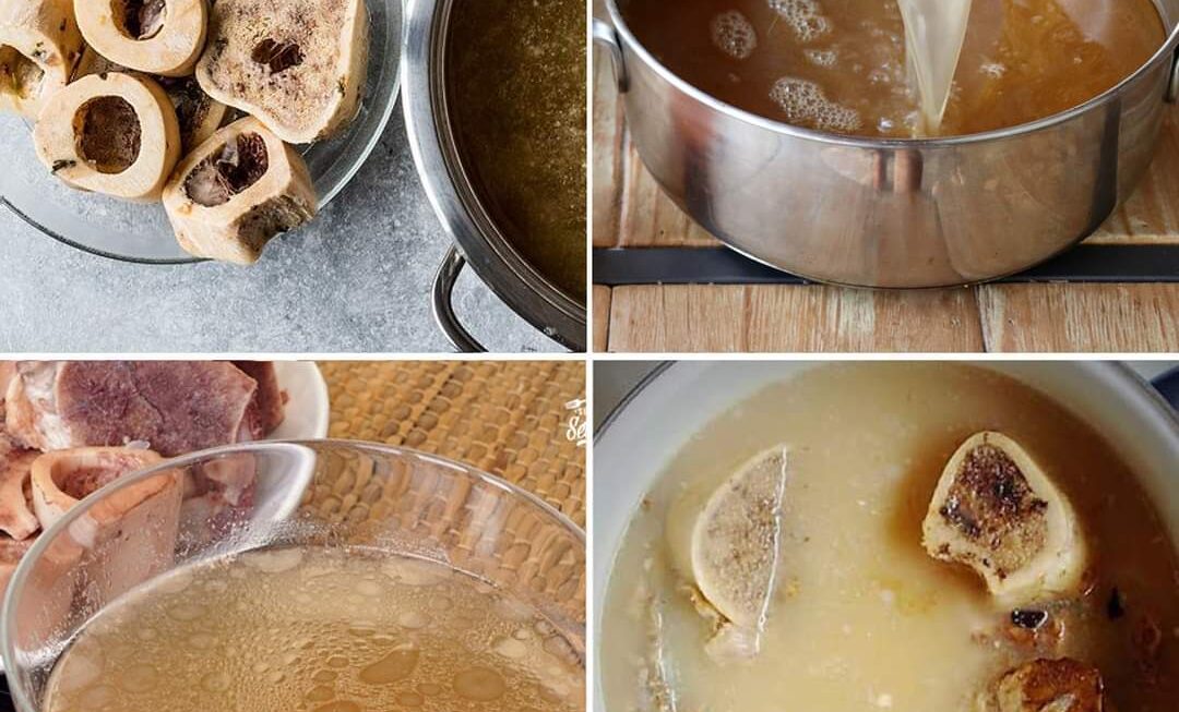 - Reduce el fuego a bajo y deja que los huesos se cocinen a fuego lento. El tiempo de cocción puede variar según tus preferencias; cuanto más tiempo cocines los huesos, mayor será la densidad del caldo.