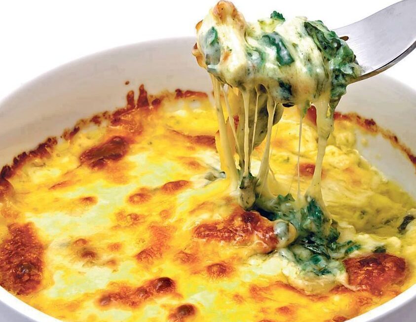 5- Hors du feu, ajouter les épinards. Mélanger et verser le tout dans un plat à gratin. 6- Parsemer d’emmental râpé et enfourner pour 15 minutes.
