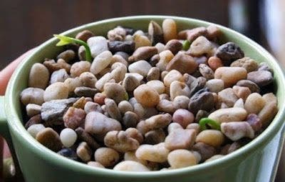 Recouvrez ensuite la terre et les graines germées de petits cailloux, et placez le pot dans un endroit ensoleillé, en veillant à ce que la terre reste humide.