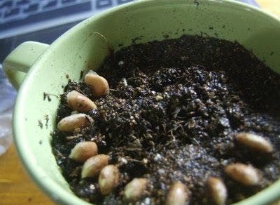 Remplissez le pot de fleurs ou la tasse de terreau et enfoncez-y les graines à moitié