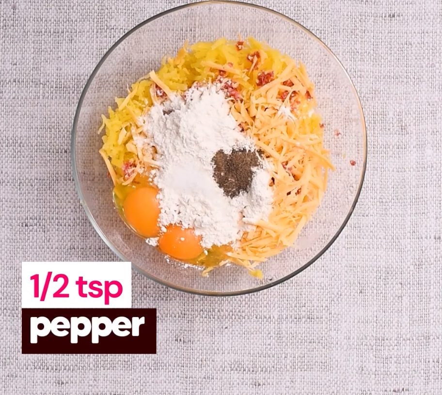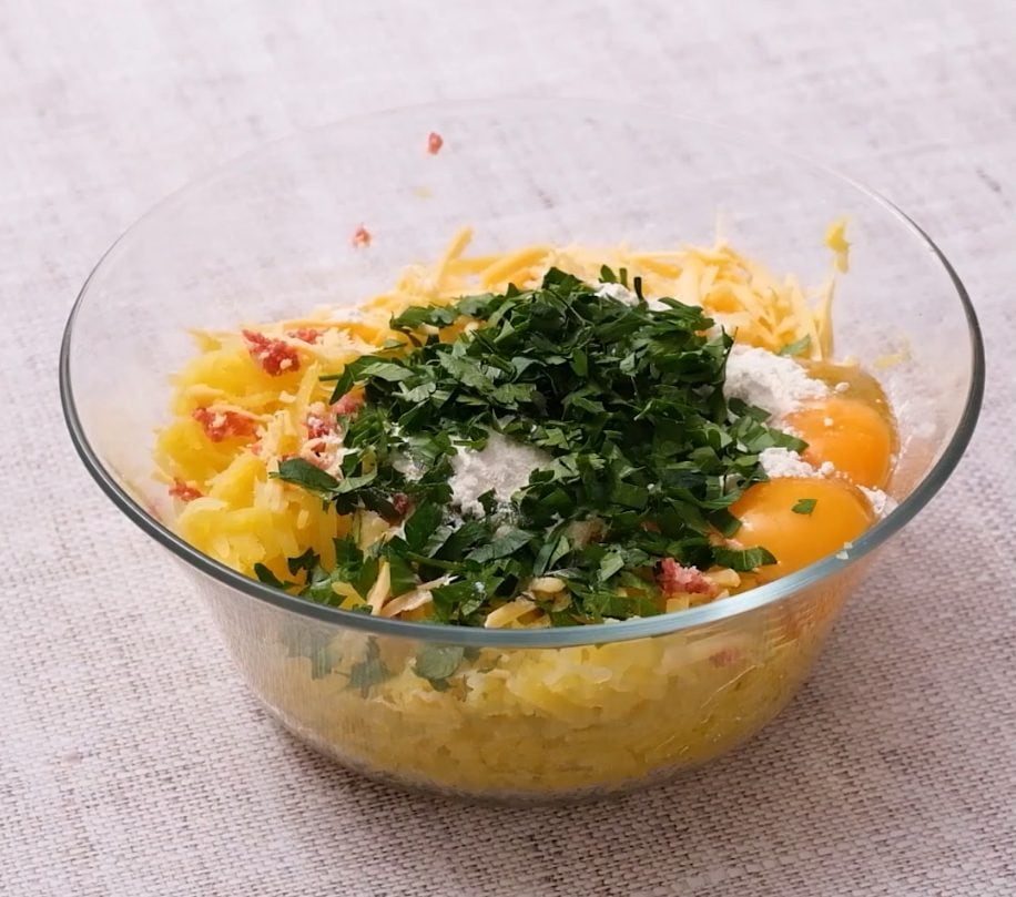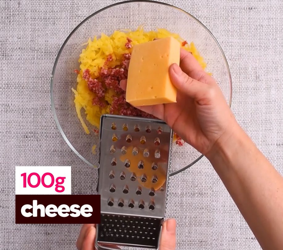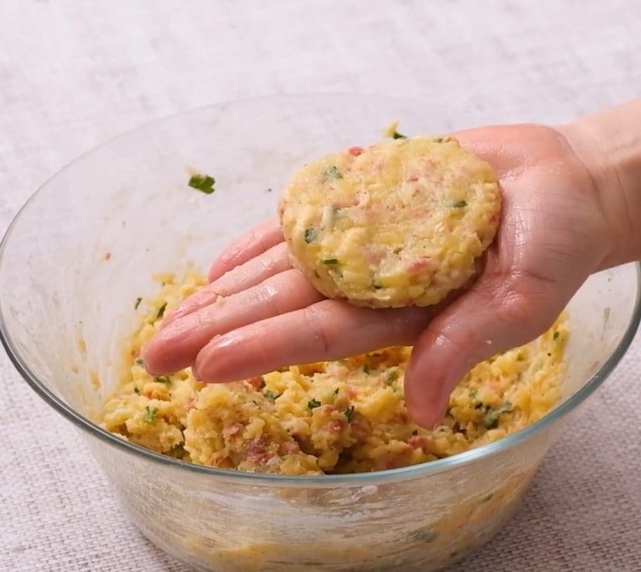 Râpez les pommes de terre bouillies, le salami et le fromage dans un grand bol à mélanger. Ajoutez le reste des ingrédients et mélangez pour former une pâte.