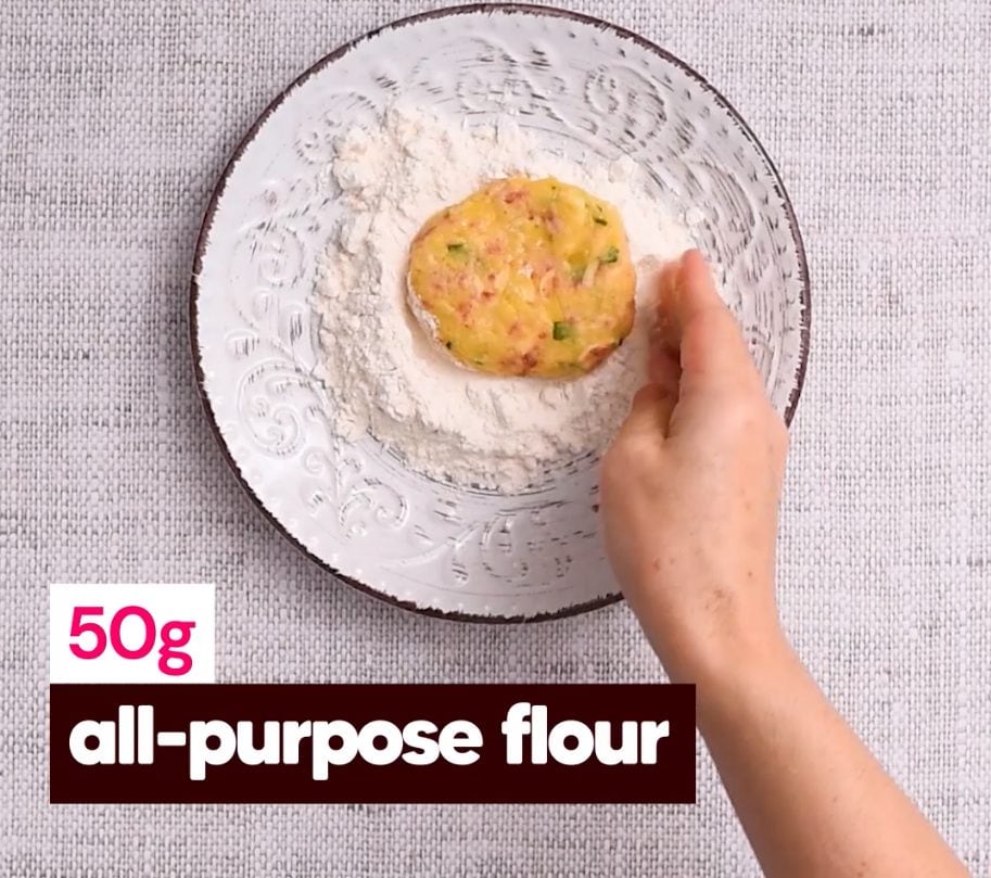 Mettez un peu de farine dans une grande assiette peu profonde. Saupoudrez chacun des beignets de pommes de terre de farine.