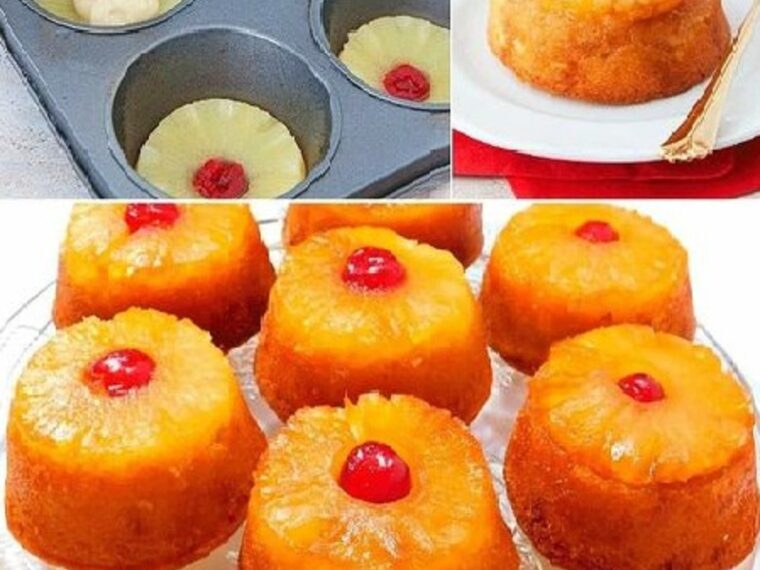 4. Filtrez l’ananas et réservez le jus pour préparer le mélange à gâteau. Coupez chaque tranche en 8 parts et placez 3 parts dans chaque moule. Coupez ensuite chaque cerise en deux et mettez une moitié dans chaque moule.