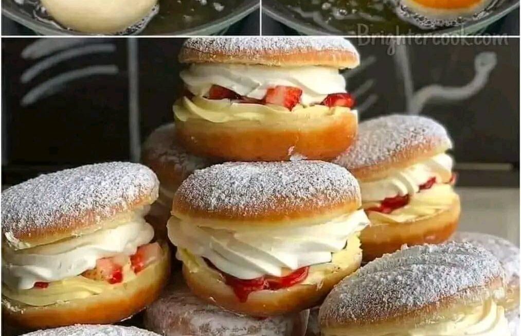 Aplatissez un peu chaque boule et roulez-la à nouveau en boule. Couvrir et laisser reposer encore 30 minutes. Frire les boules dans l’huile chaude à feu doux pendant 2-3 minutes de chaque côté. Laisser refroidir un peu et couper en deux dans le sens de la longueur, comme un pain à burger. Garnir une moitié de chantilly et de fraises hachées, refermer avec l’autre moitié, saupoudrer de sucre glace et servir.