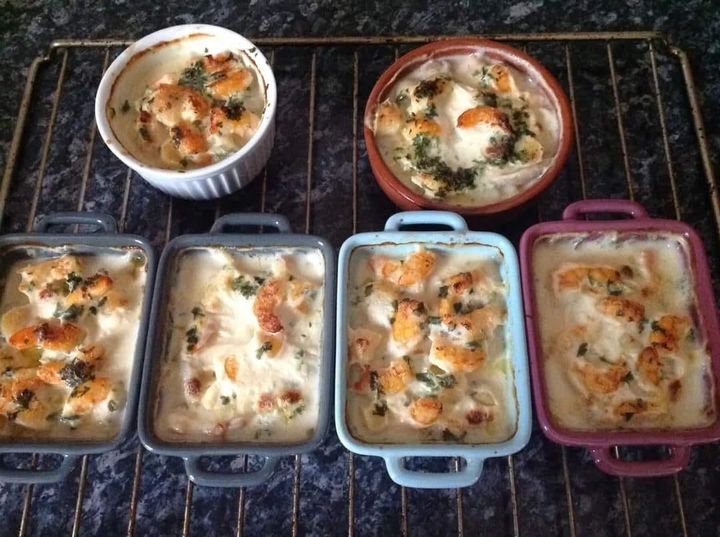 Ajouter dans chacune d’elles : oignons, champignons, les noix de Saint-Jacques ainsi que 5 crevettes et le persil préalablement haché. Réserver.
