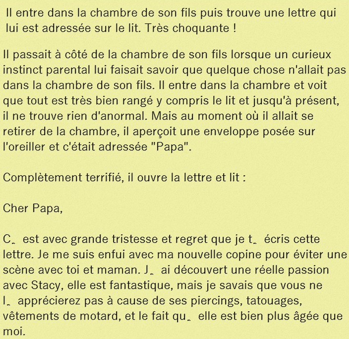 Uncategorized Ce papa a trouvé une lettre bouleversante sur le lit de son fils .. February 24, 2024 by Go ReadLeave a Comment on Ce papa a trouvé une lettre bouleversante sur le lit de son fils .. lire la suite en page suivante Post Views: 112 Go Read Website https://goread.online