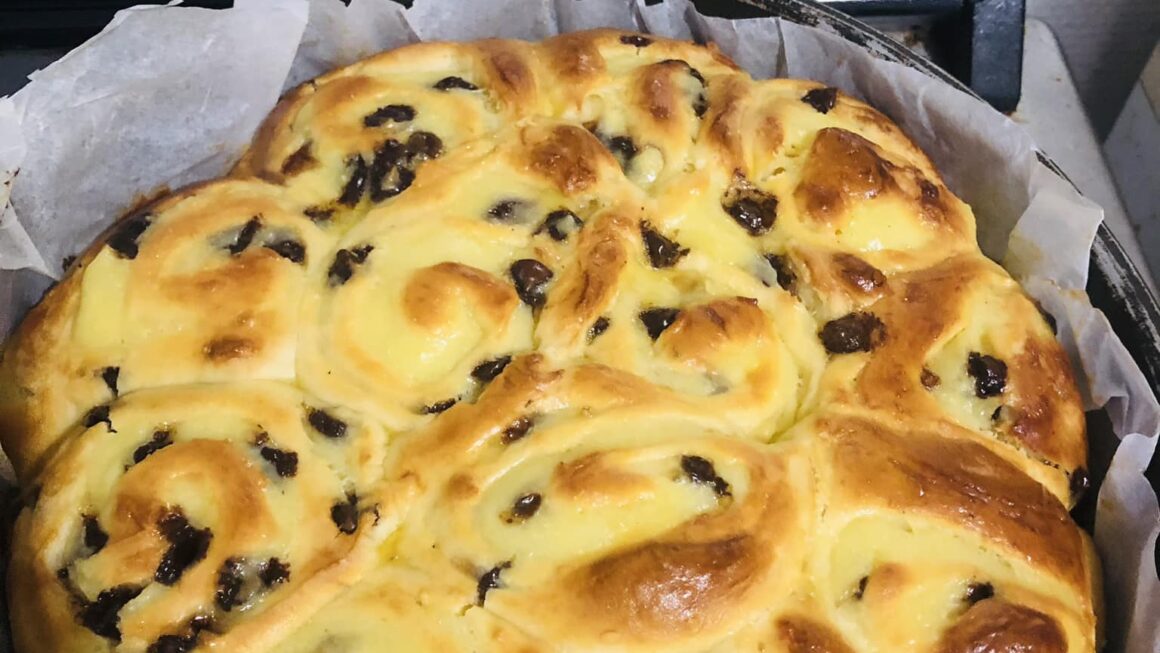 Tartinez de crème pâtissière et parsemez de pépite de chocolat ou de raisins sec .