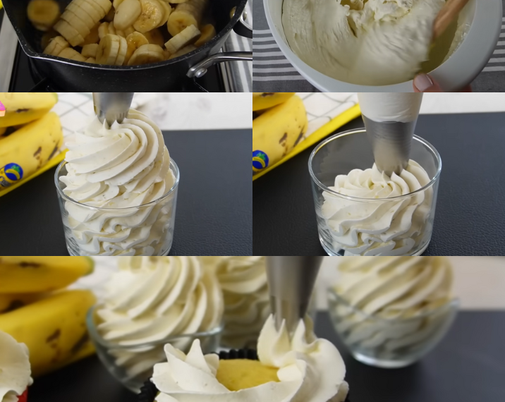 Une fois refroidie, battez la crème de banane dans un bol séparé pour lui donner une texture crémeuse. Dans un autre bol, battez 500 ml de crème bien froide jusqu’à ce qu’elle soit ferme. Incorporez ensuite délicatement la crème de banane à la crème fouettée jusqu’à obtenir une texture lisse et épaisse.