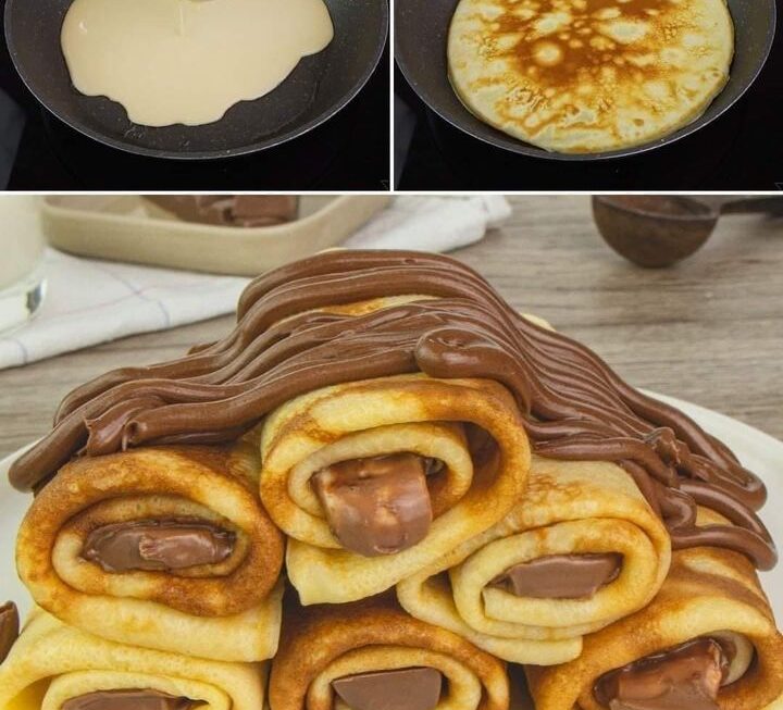 Cuire sur une plaque huilée des deux côtés. Pliez la crêpe en deux, mettez le chocolat, et roulez.