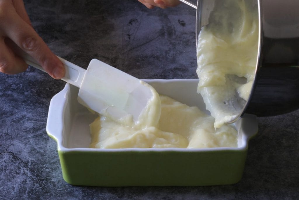 Faire chauffer le lait avec le zeste de citron, puis le verser bouillant sur les œufs avec la fécule de maïs et mélanger au fouet. Mettez sur le feu et faites cuire jusqu’à épaississement, puis transférez-le dans un plat allant au four pour le laisser refroidir8.
