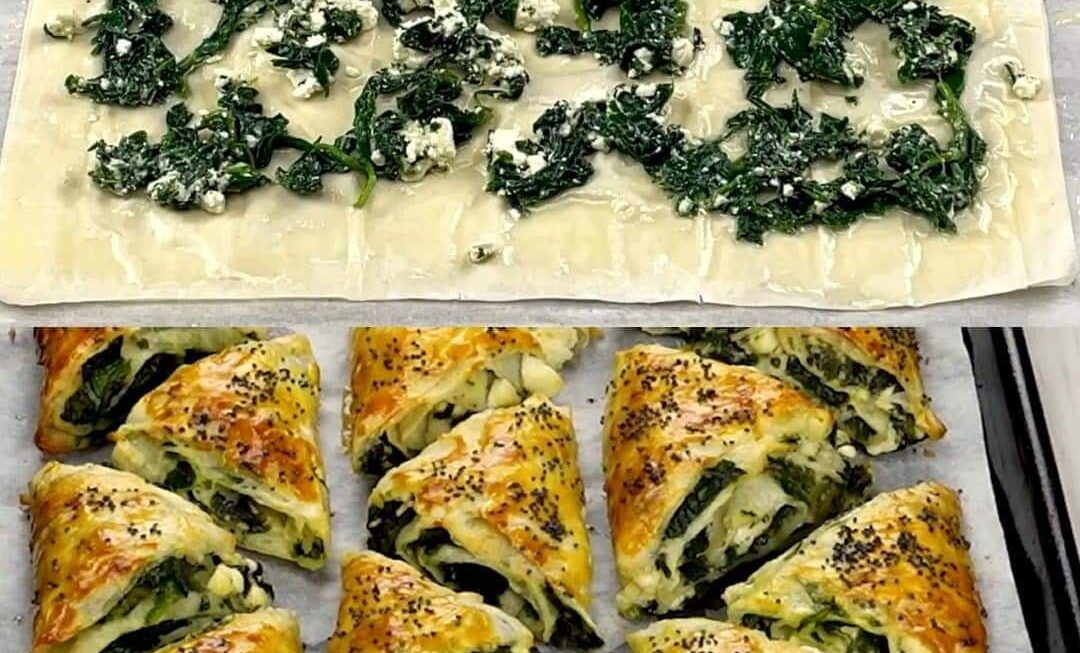 Mélanger le fromage feta et cuire les épinards et les étaler sur la pâte filo. Rouler d’un bout à l’autre pour obtenir une bande.