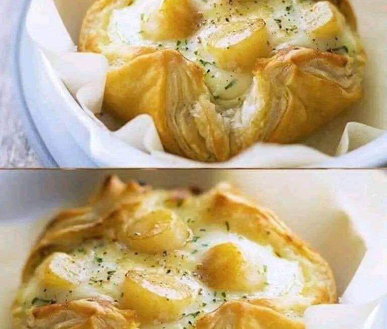 Recouvrir avec une nouvelle pâte feuilletée dans lequel on aura fait un petit trou, Coller les bords et badigeonner au jaune d’oeuf.
