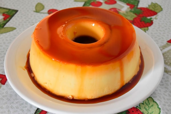 2. Placez une assiette à l’envers sur le moule et, en tenant les deux, retournez-la rapidement pour que le flan retombe avec le caramel dessus.
