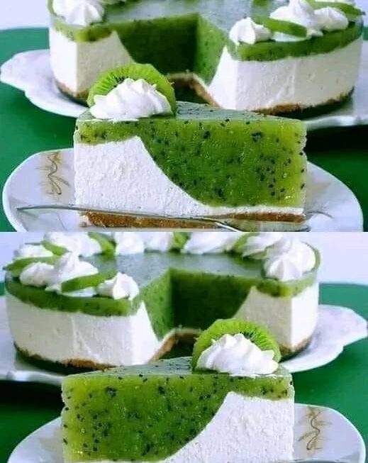 Faire tremper la gélatine selon les instructions sur le paquet puis mélanger avec la purée de kiwi puis verser délicatement sur la crème blanche. Réfrigérer le gâteau une nuit et servir le lendemain.