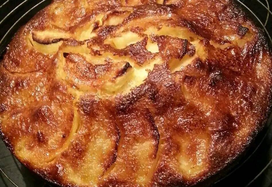 4. Versez la moitié de la pâte dans le moule, disposez les tranches de pommes, puis recouvrez du reste de pâte.