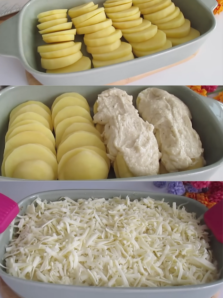Dans un plat de taille (38X20 cm), disposez une couche de rondelles de pommes de terre. Versez une partie de la sauce béchamel sur les pommes de terre. Répétez l’opération pour créer plusieurs couches.