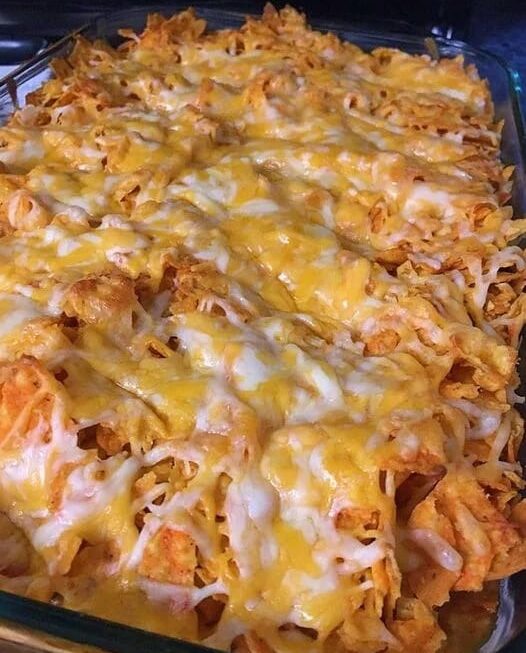 Répétez les couches et terminez par une généreuse couche de fromage et de Doritos.