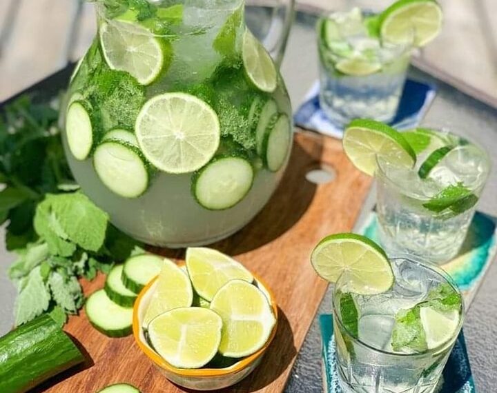 2 litres d’eau 1 citron 1 concombre 1 tige de menthe