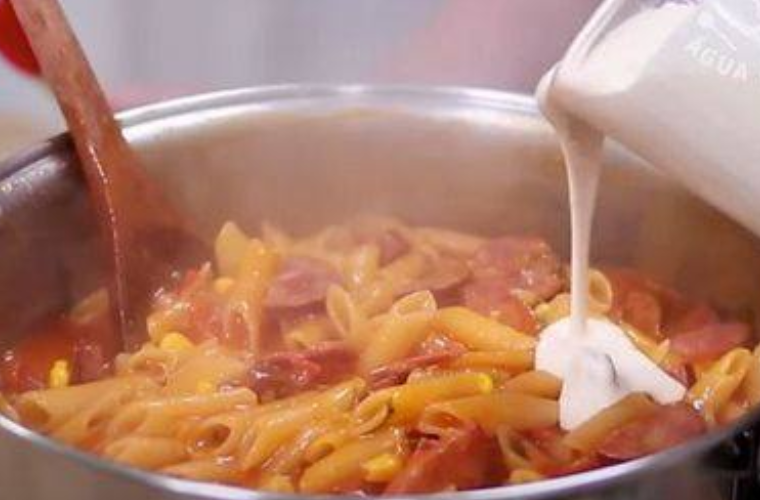 2. Ajoutez ensuite les pâtes, remuez de temps en temps pour que ça ne colle pas, puis ajoutez la sauce, l’oignon et l’ail.