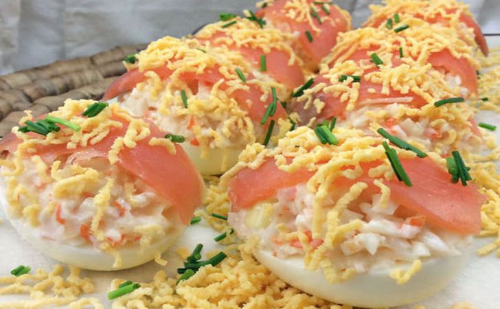 Remplissez les oeufs avec le mélange oeufs/saumon, ajoutez un peu de garniture sur les » chapeaux » mis de côté , décorez avec des lamelles de saumon et des brins de ciboulette et mettez au frais jusqu’au moment de servir.