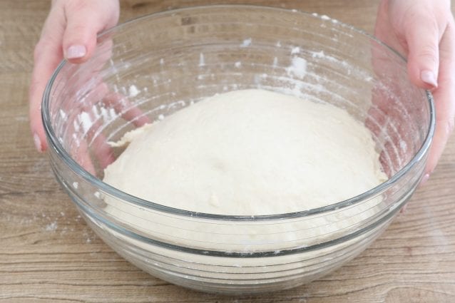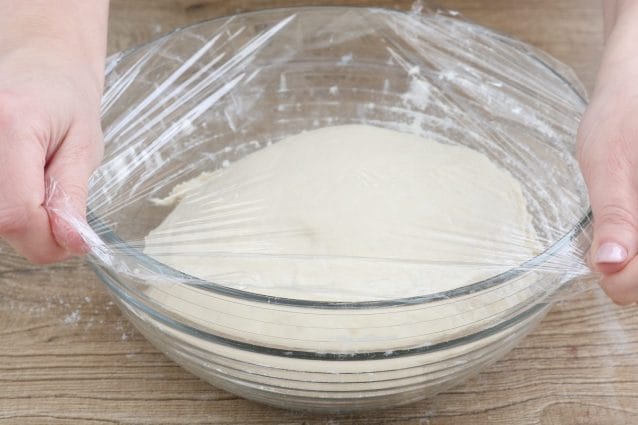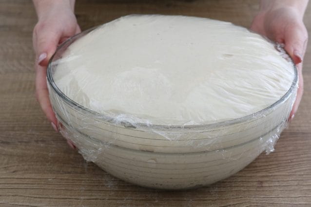 Couvrir d’un film alimentaire et laisser lever environ 3 heures, jusqu’à ce qu’il double de volume.19. Vous pouvez conserver le bol dans un endroit chaud et humide (ou au four éteint avec la lumière allumée).