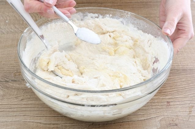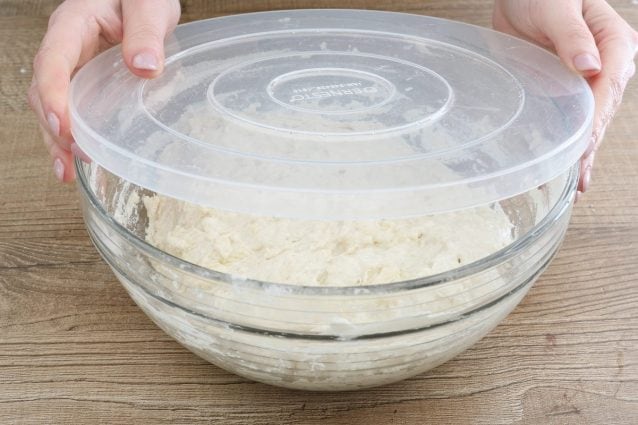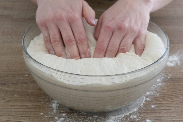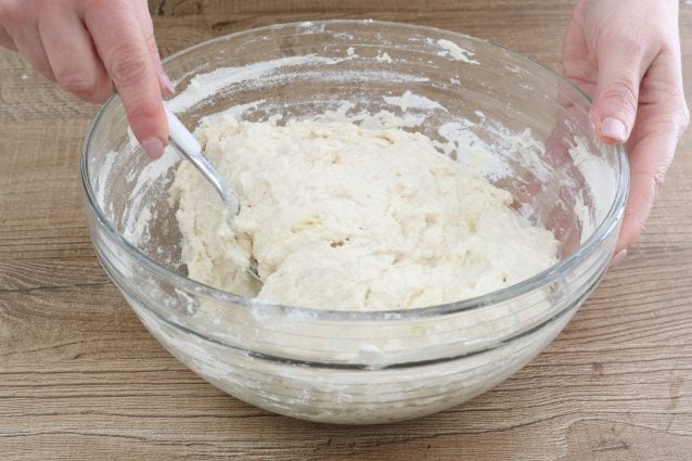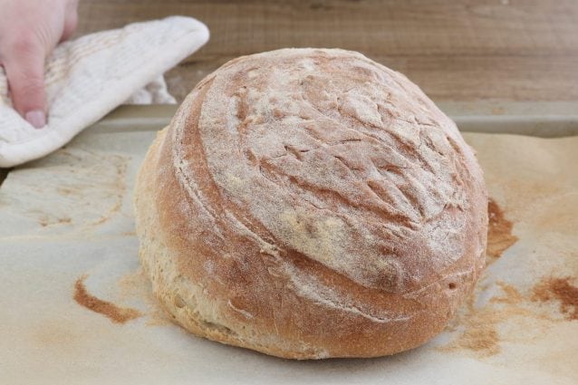 Pour obtenir une mie moelleuse et bien alvéolée, il faut laisser bien lever le pain : les ingrédients sont mélangés grossièrement, le mélange obtenu est laissé reposer dans le bol, puis les plis sont réalisés comme expliqué dans la procédure . Après le premier levage d’environ 3 heures, ou en tout cas jusqu’à ce que le volume ait doublé, les plis sont refaits pour incorporer le plus d’air possible à la pâte. Celui-ci doit être cuit immédiatement, sans attendre une seconde levée qui aura cependant lieu au four pendant la cuisson.