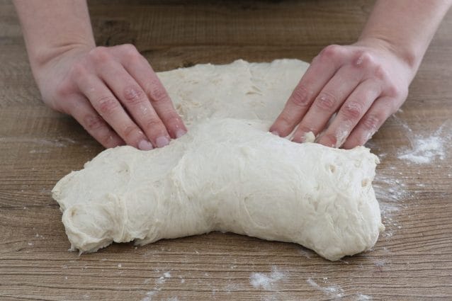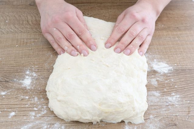 Aplatir délicatement la pâte en l’étalant comme pour former un rectangle12.