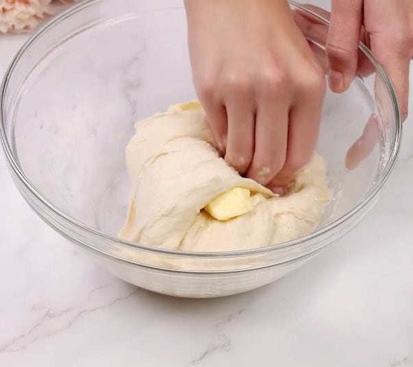 Pétrissez la pâte avec vos mains. La pâte doit être lisse et élastique. Travaillez le beurre dans la pâte, puis placez-la dans un endroit chaud pendant au moins deux heures (la pâte doit doubler de volume).