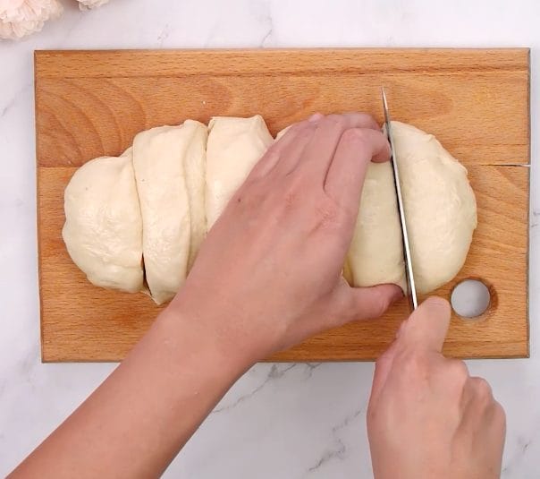 Une fois qu’elle a doublé de volume, pétrissez la pâte et coupez-la en six morceaux.