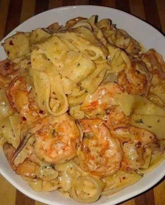 6. Ajoutez maintenant les pâtes et les crevettes en mélangeant jusqu’à ce que les pâtes soient complètement recouvertes de sauce. Au moment de servir, décorez avec le persil haché et vous pouvez ajouter un peu plus de parmesan