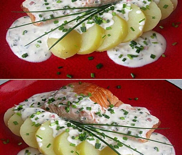 Servir le pavé de saumon avec les pommes de terre coupées en rondelles, napper généreusement de la sauce crémeuse à la ciboulette. Une préparation simple, mais pleine de saveurs et de textures qui ravira les papilles. Bon appétit !