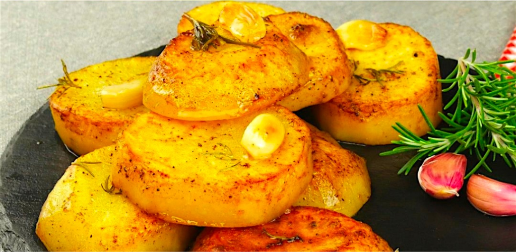 Mettez le beurre dans une poêle jusqu’à ce qu’il soit fondu, ajoutez les tranches de pommes de terre jusqu’à ce qu’elles soient dorées. Retournez-les, ajoutez des blocs de beurre, du romarin et du bouillon de volaille.