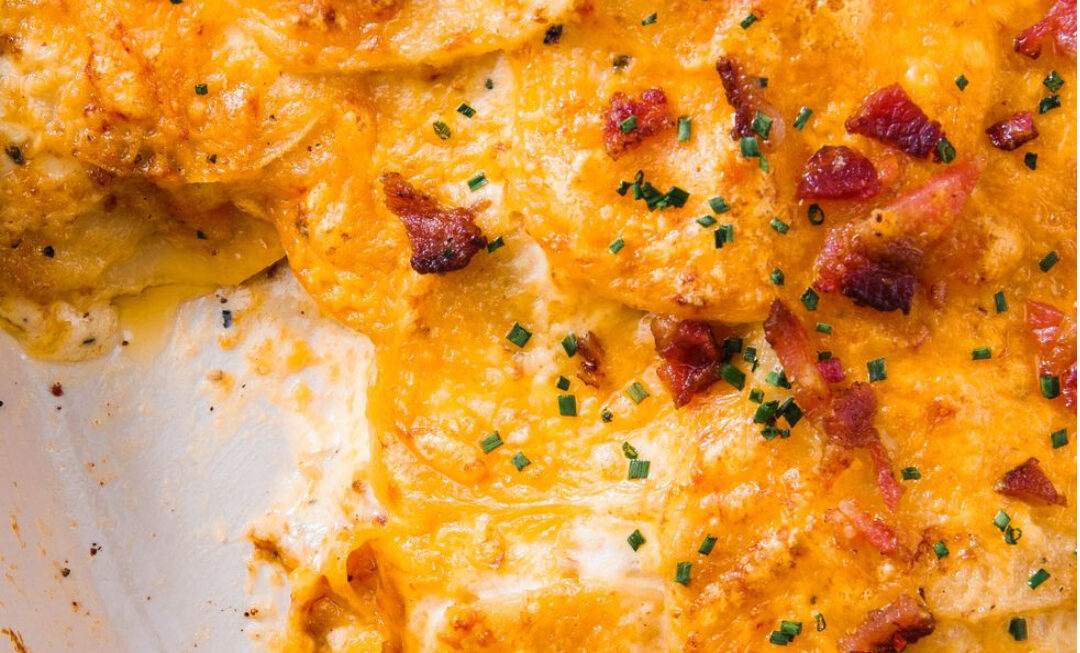 À l’aide d’une cuillère, déposer une fine couche de sauce au fond d’une grande cocotte. Ajouter une seule couche de pommes de terre sur le dessus. À l’aide d’une cuillère, verser plus de sauce sur les pommes de terre et garnir de fromage et de bacon. Répétez 3 à 4 fois, ou jusqu’à ce que la cocotte soit presque pleine.