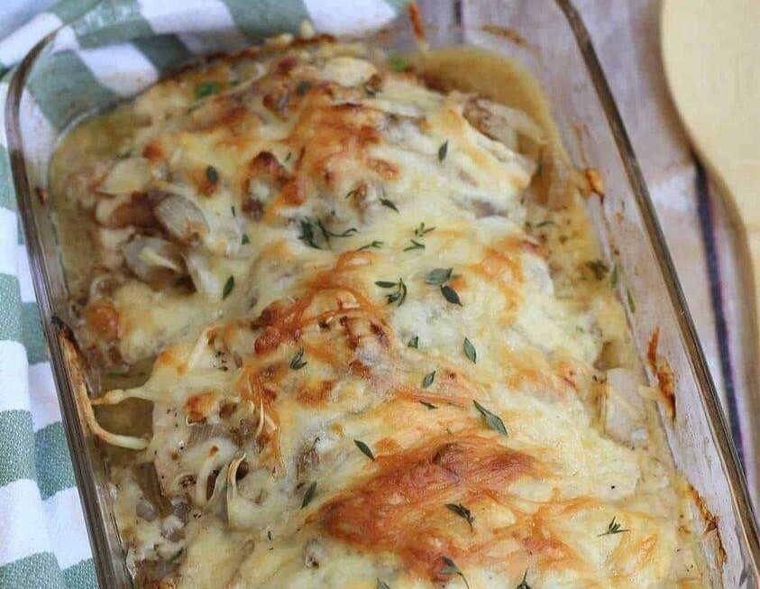 Placez les oignons restants sur le dessus du poulet avec la mozzarella et le parmesan.