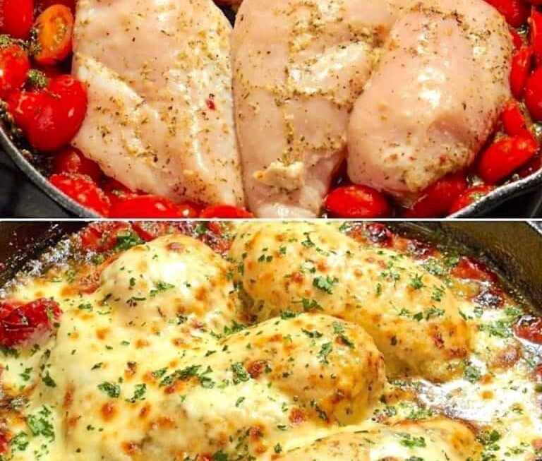 Ce savoureux repas à un seul plat est sûr d’être un gagnant du dîner ! Le poulet est cuit dans du beurre à l’ail, accompagné de tomates balsamiques douces rôties et de mozzarella fondue. Servir avec des pâtes, du riz ou des légumes et beaucoup de pain croûté pour éponger la magnifique sauce.