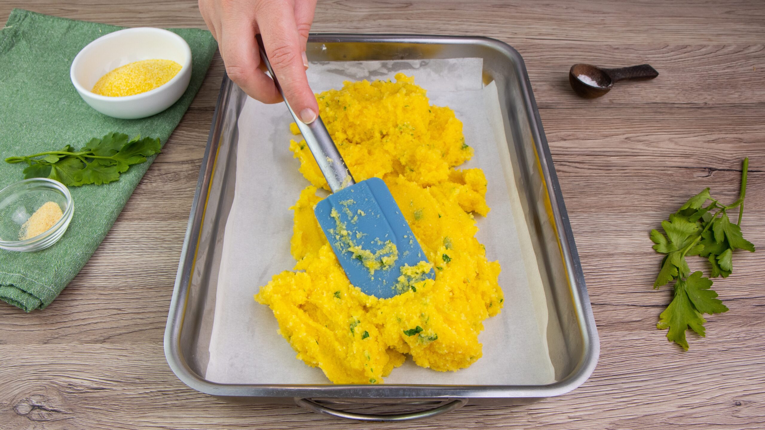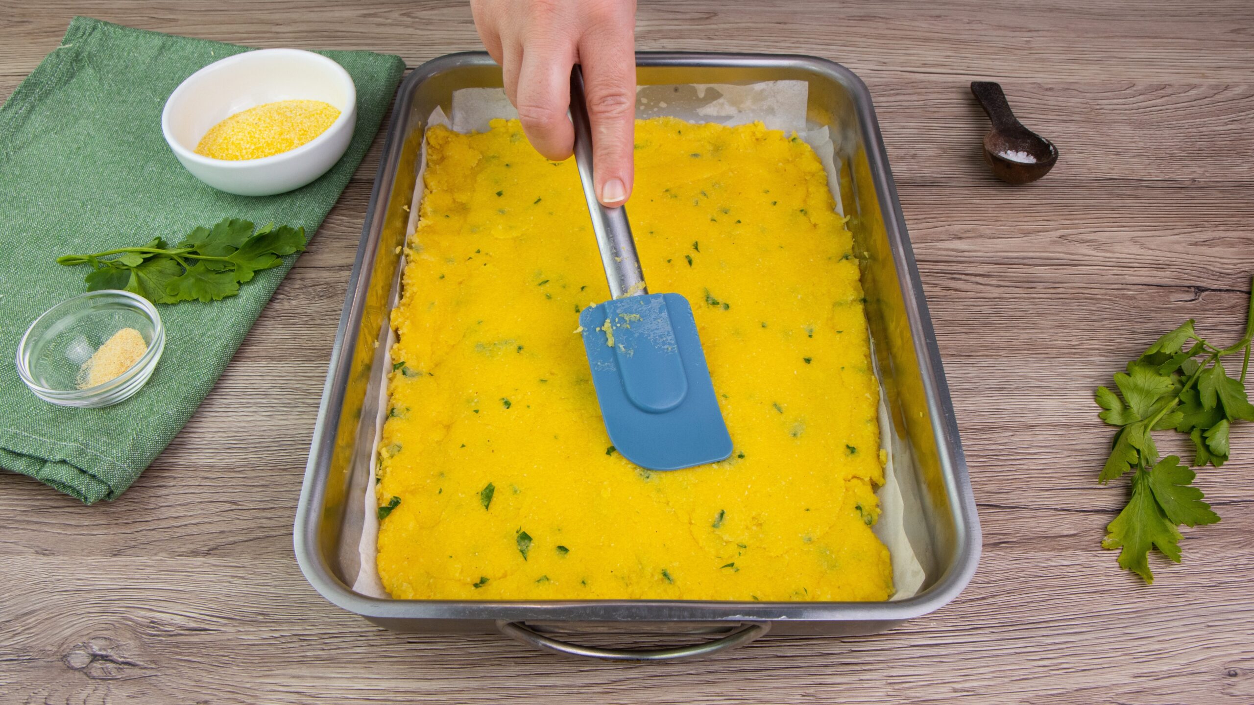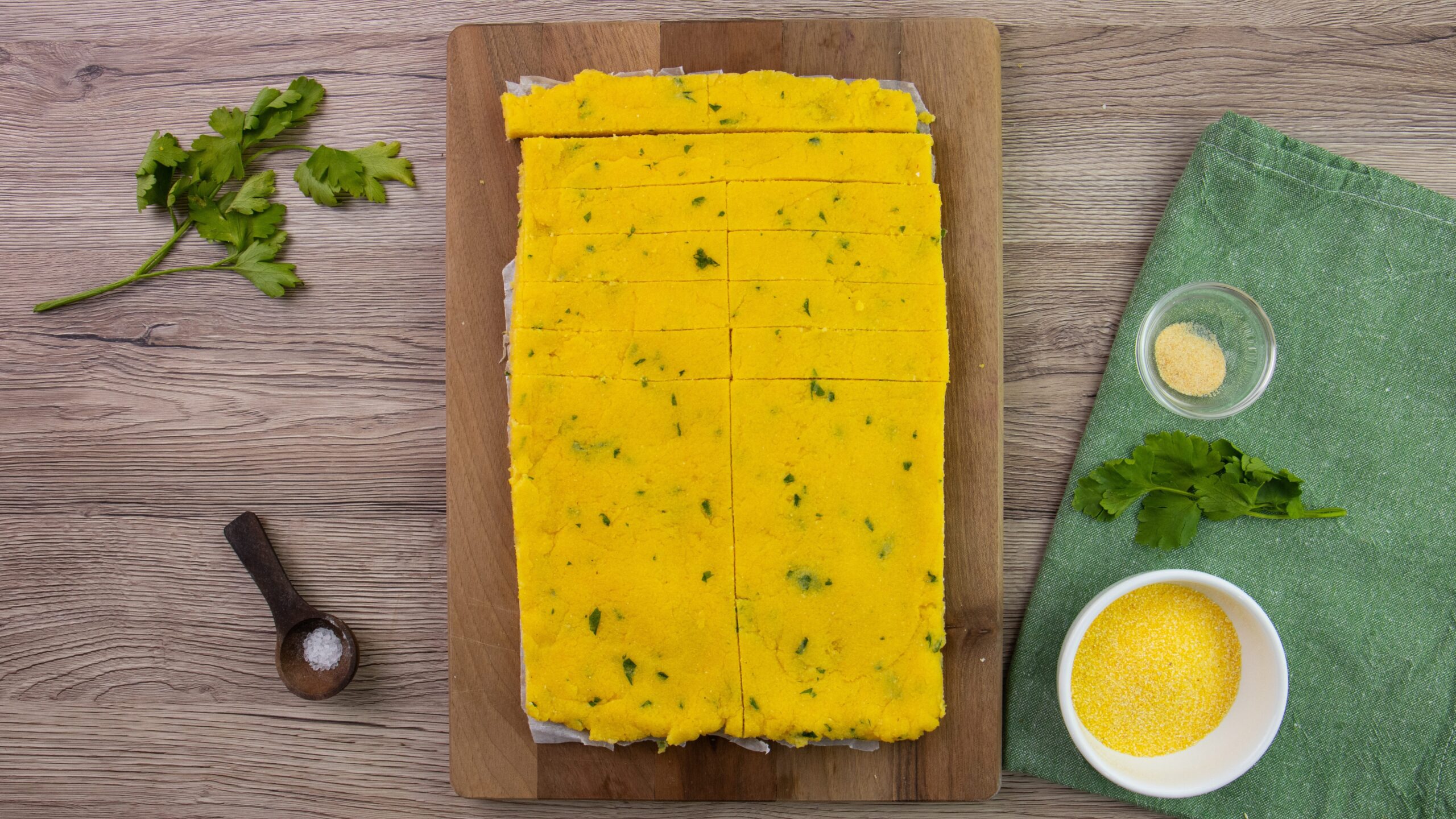 Transférer le mélange de polenta sur une plaque recouverte de papier sulfurisé. Utilisez une spatule pour lisser le mélange et réfrigérez pendant au moins 2 heures. Une fois réfrigérée, coupez la polenta en petits rectangles. Transférez-les dans la poêle et badigeonnez-les d’huile. Cuire au four jusqu’à ce qu’il soit doré.