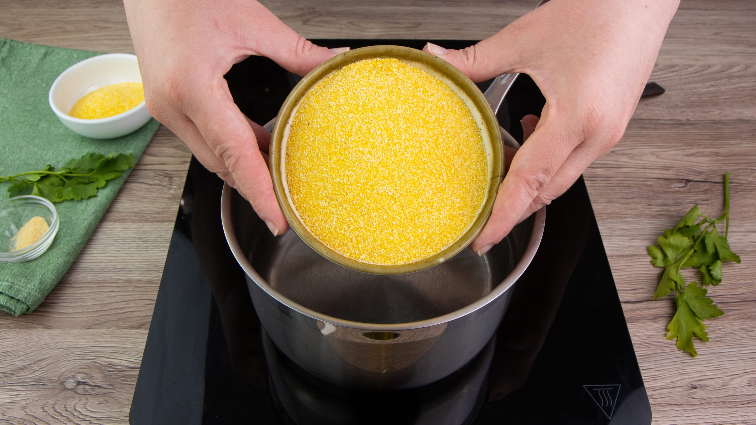 Dans une cocotte, ajoutez l’eau et la polenta et faites cuire à feu doux jusqu’à ce qu’elle épaississe.