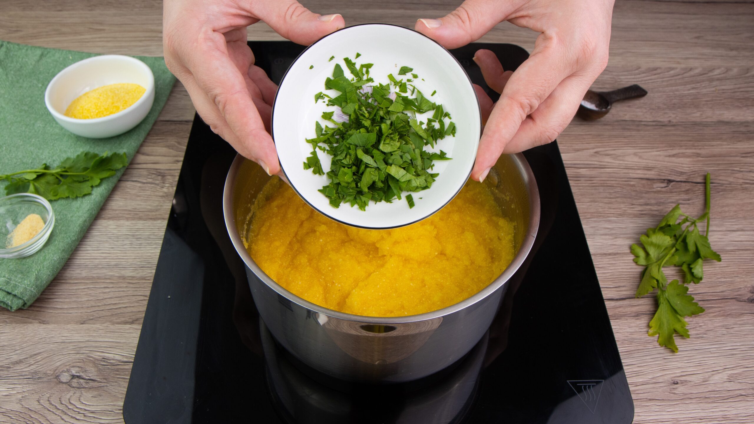 Après un certain temps, coupez la polenta avec le couteau en petits morceaux rectangulaires.