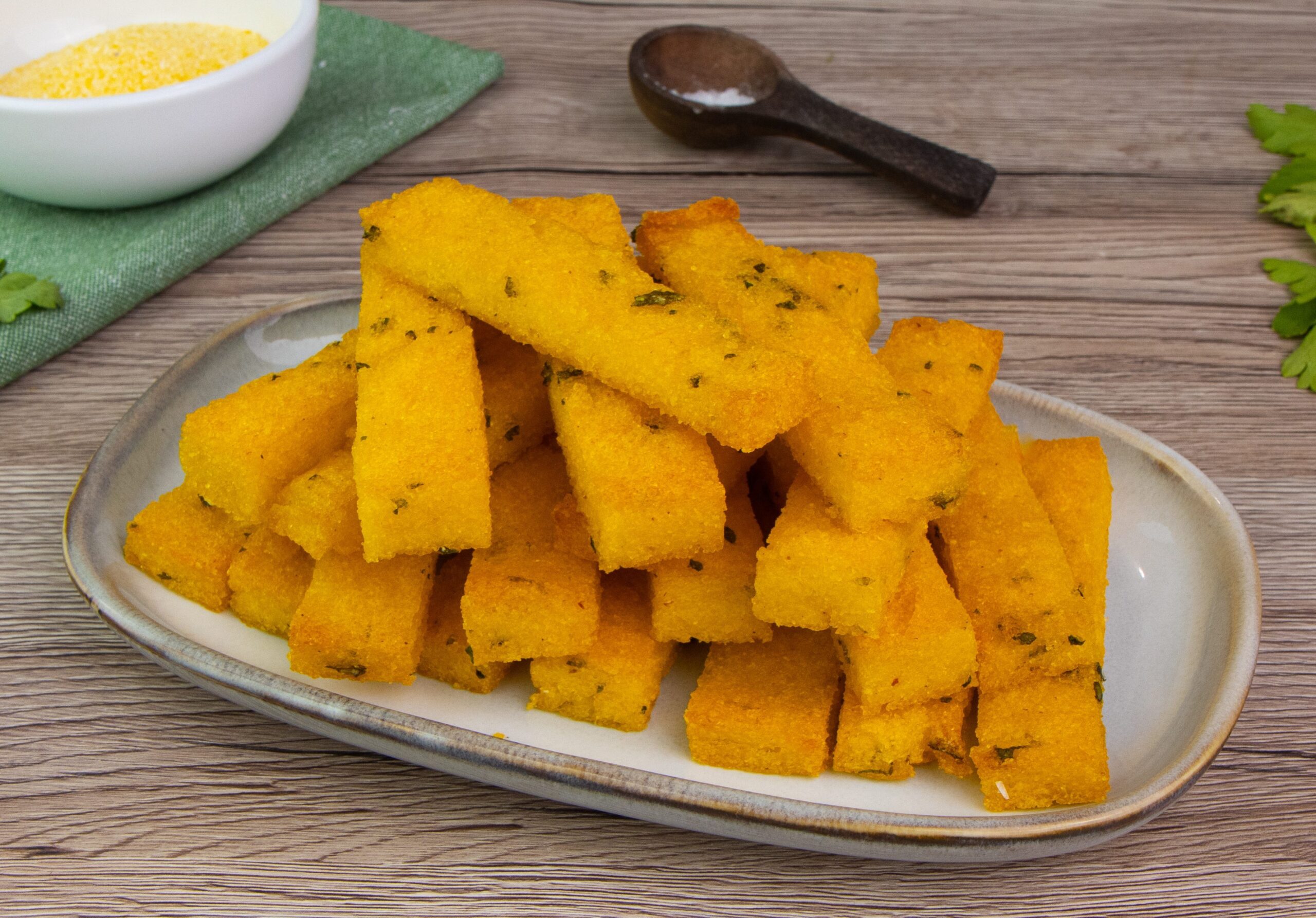 La polenta est un type de bouillie de semoule de maïs, souvent servie en accompagnement d’un plat principal. Ces frites de polenta croustillantes sont une variante de la bouillie de polenta classique. Après la cuisson de la polenta, elle est mélangée avec des herbes et cuit au four jusqu’à ce qu’elle soit croustillante. . Le résultat? Des frites de polenta croustillantes à l’extérieur. Tandis que doux et crémeux à l’intérieur.