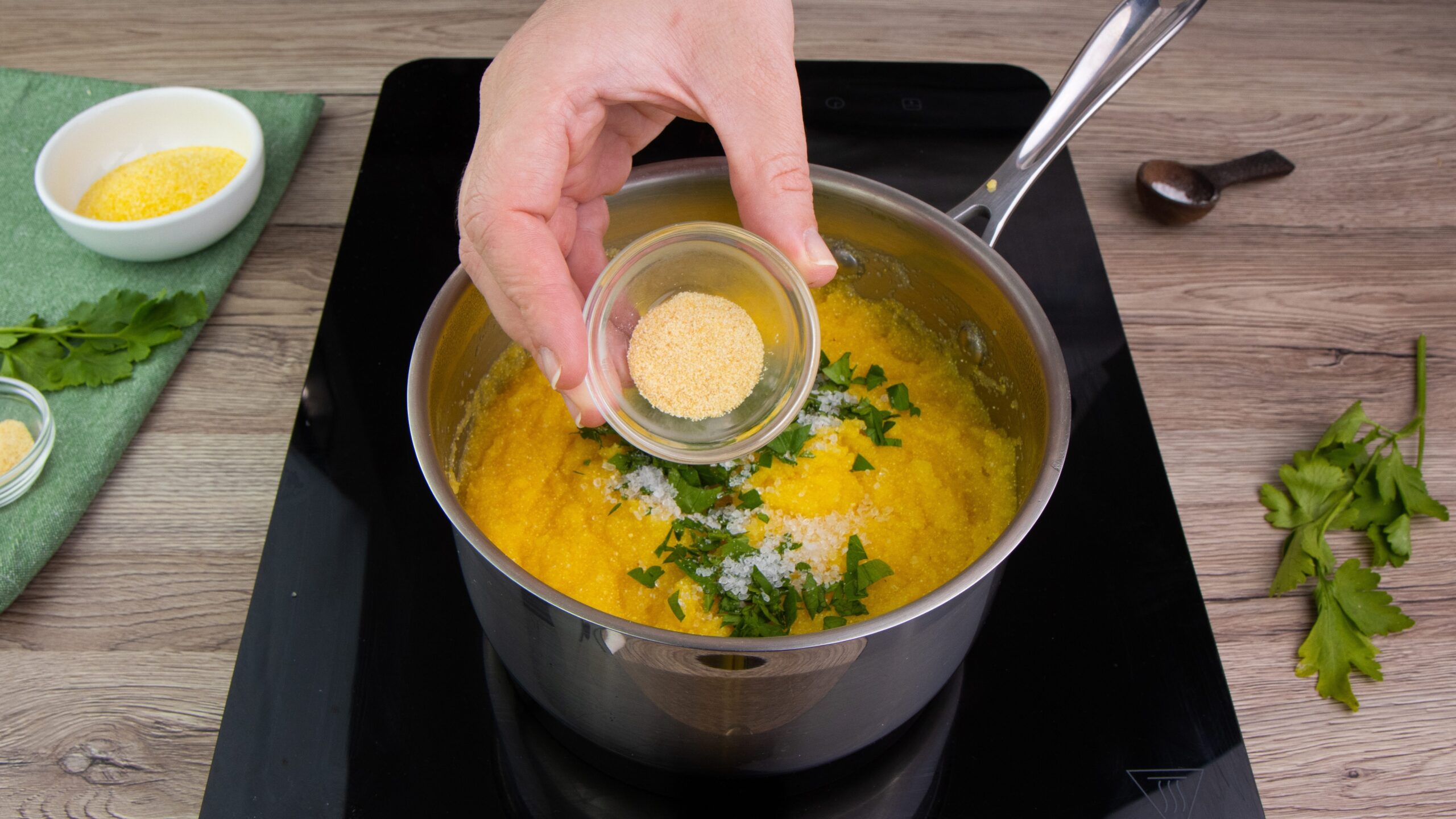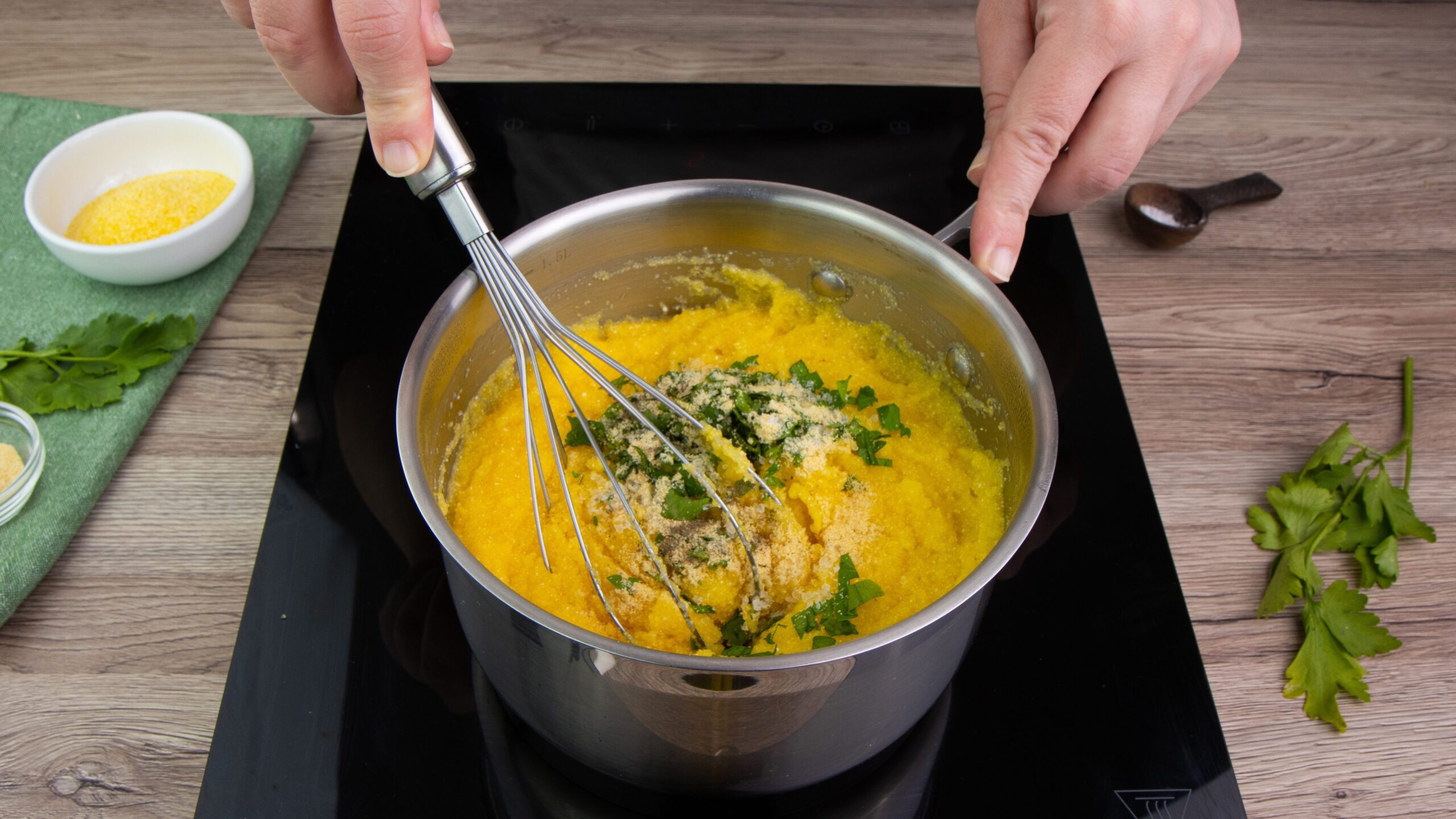 Faites cuire la polenta. Ajouter l’eau et la polenta dans une casserole et porter à ébullition. Baissez le feu et poursuivez la cuisson jusqu’à ce que le mélange épaississe. Une fois la polenta cuite, mélangez-la avec l’assaisonnement.