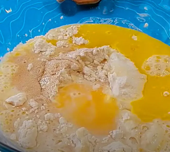 Dans un grand saladier, versez la farine, le levain, le sucre, l’œuf battu, le beurre fondu ainsi que le lait d’amande et le sel. Mélangez le tout avec une spatule en bois.