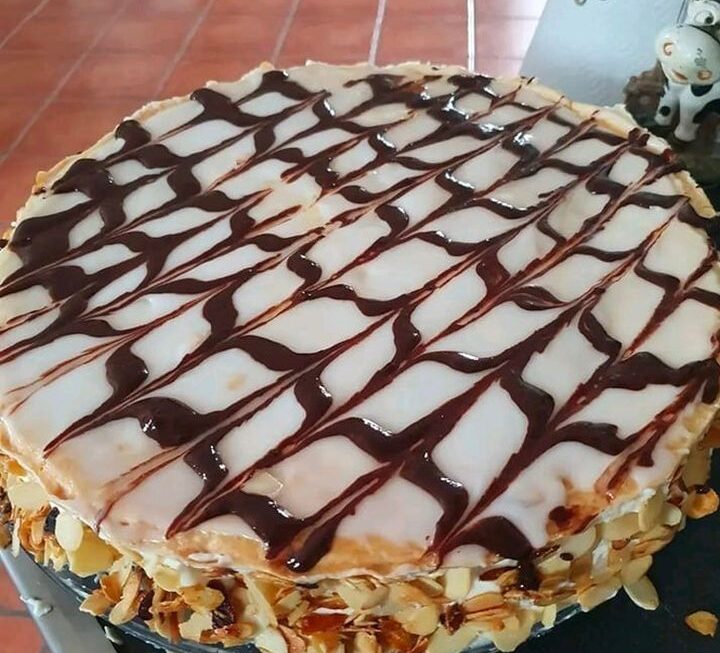 maintenant il ne reste plus qu’a les décorer: faire tiédir le fondant blanc puis l’étaler sur chaque mille-feuilles, décorer aussitôt avec le chocolat fondu: (on met le chocolat fondu dans un cornet de papier sulfurisé, ou dans un sac de congélation puis on trace des lignes parallèles (pour les gâteaux sous forme rectangulaire) ou une spirale (pour les gateaux ronds)