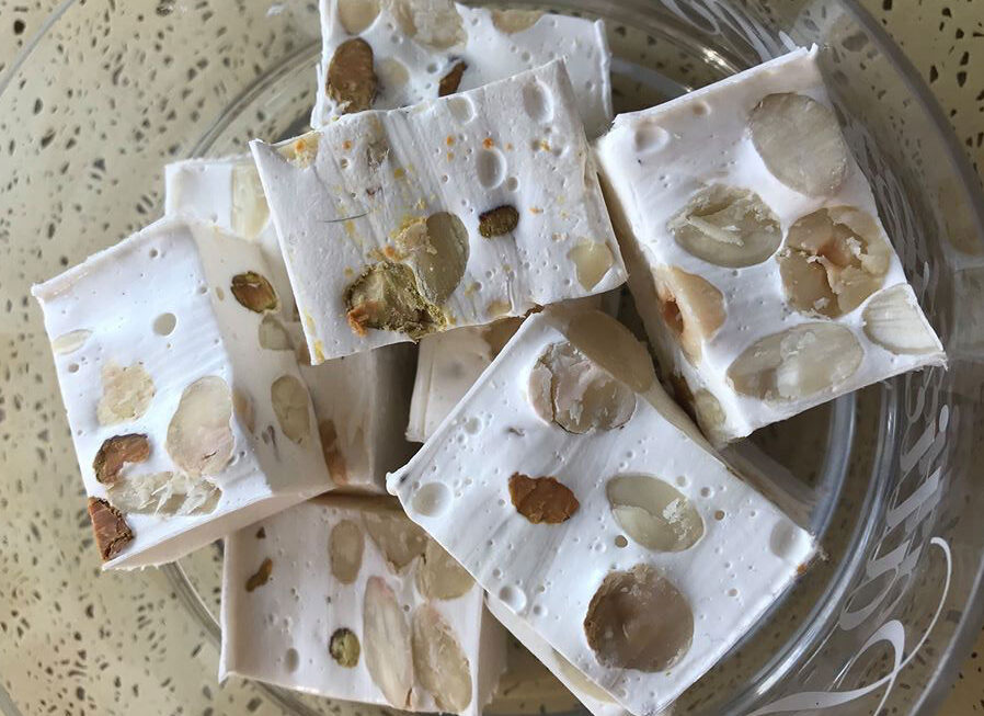 Le Nougat est une délicieuse confiserie à base de blanc d’œuf, de miel et de fruits secs et qui est entourée de feuille azyme afin de le manipuler sans qu’il ne colle.