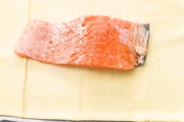 Assaisonnez le filet de saumon avec du sel et du poivre et placez-le au centre de la pâte. Enveloppez-la soigneusement et découpez des fentes dans la pâte pour créer des aérations afin que l’humidité puisse s’échapper. Badigeonnez la pâte de saumon d’une dorure à l’œuf et enfournez jusqu’à ce qu’elle soit dorée !