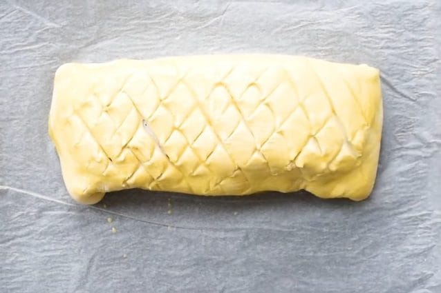 Badigeonner d’oeuf battu le dessus et les côtés de la pâte. Utilisez un couteau bien aiguisé pour faire quelques entailles dans la pâte. Poursuivez avec une autre dorure aux œufs.