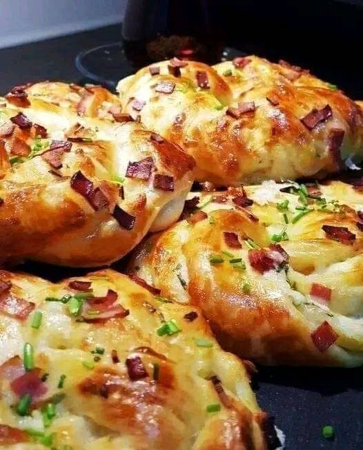4- Aplatir la pâte en une forme ovale, la remplir avec la garniture au fromage et à la ciboulette et l’enrouler dans le sens de la longueur. Fermez maintenant le rouleau aux extrémités et tournez une ou deux fois. Ensuite, tordez-les en une sorte de nœud ou rapprochez les extrémités.